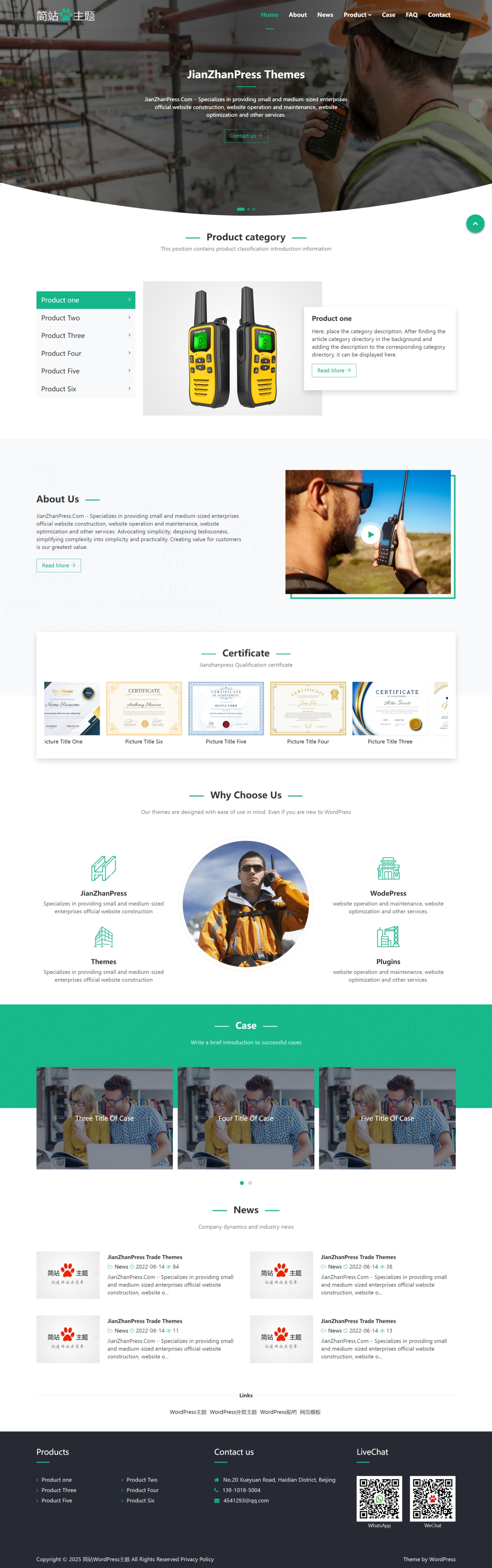 图像使用:页面中使用了高质量的图像,如工人使用对讲机的照片,以及产品和证书的图片,增强了视觉吸引力。